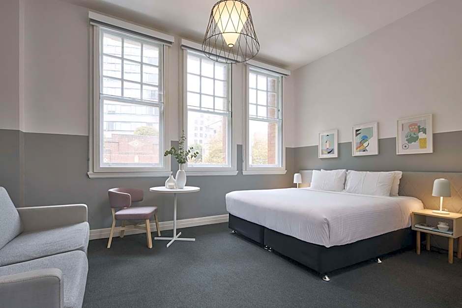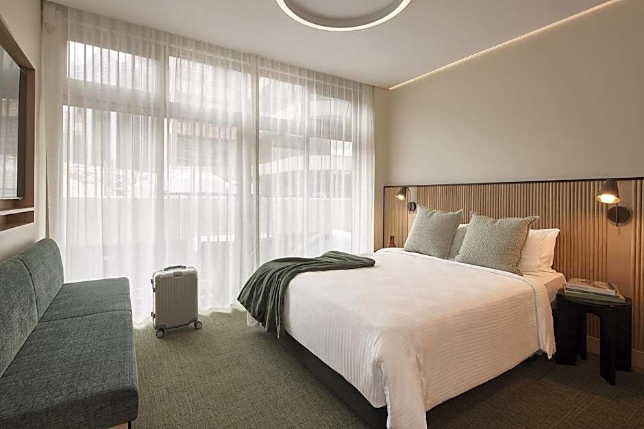 Located on the top floor of the hotel, this room features a king bed with plenty of space and a courtyard for you to step out and feel the city around you. This room has fresh air from the large glass sliding doors, air-conditioning and a flat-screen TV with mobile device pairing to watch or listen to your own content. This room type is our one and only pet friendly rooms for animals under 20 kg. Please note only the courtyard rooms can accommodate pets. Please also be advised that all of our Courtyard Rooms require deep stairs to access these rooms. Please call the hotel directly for further details.